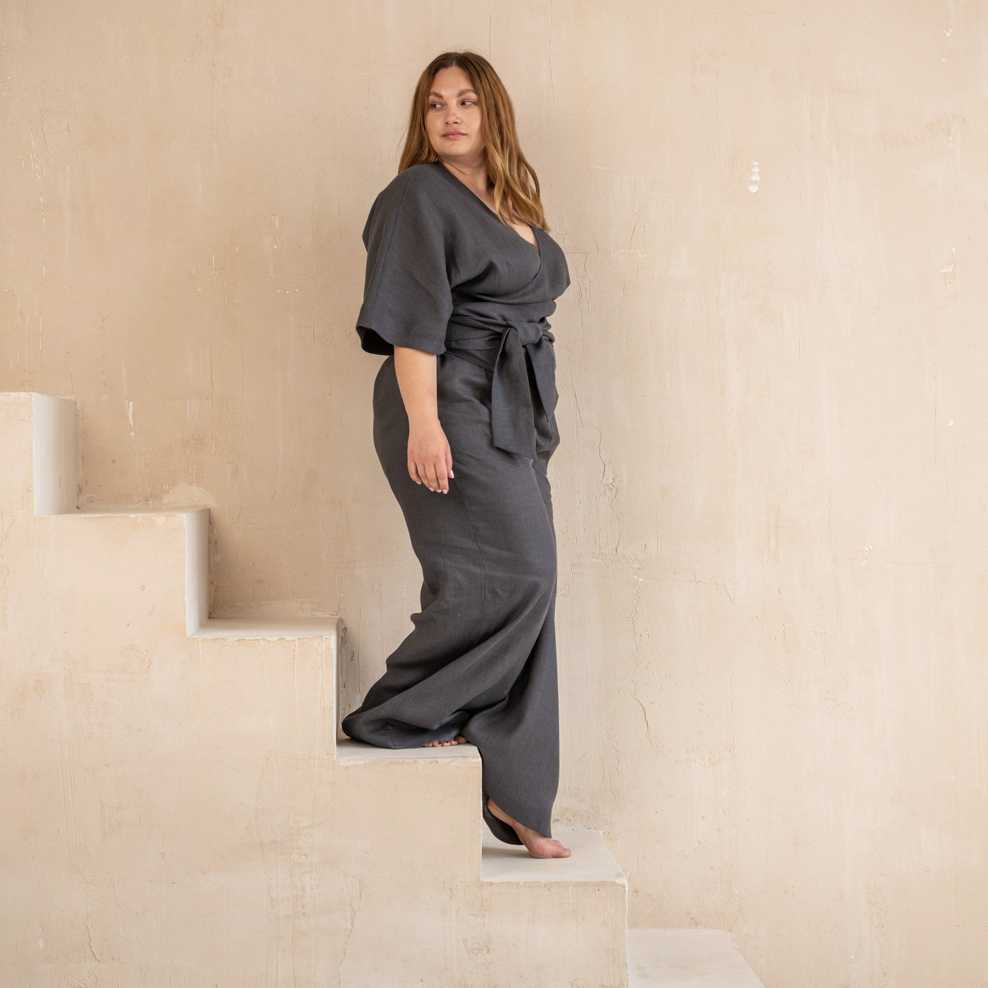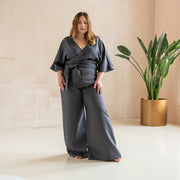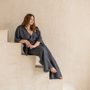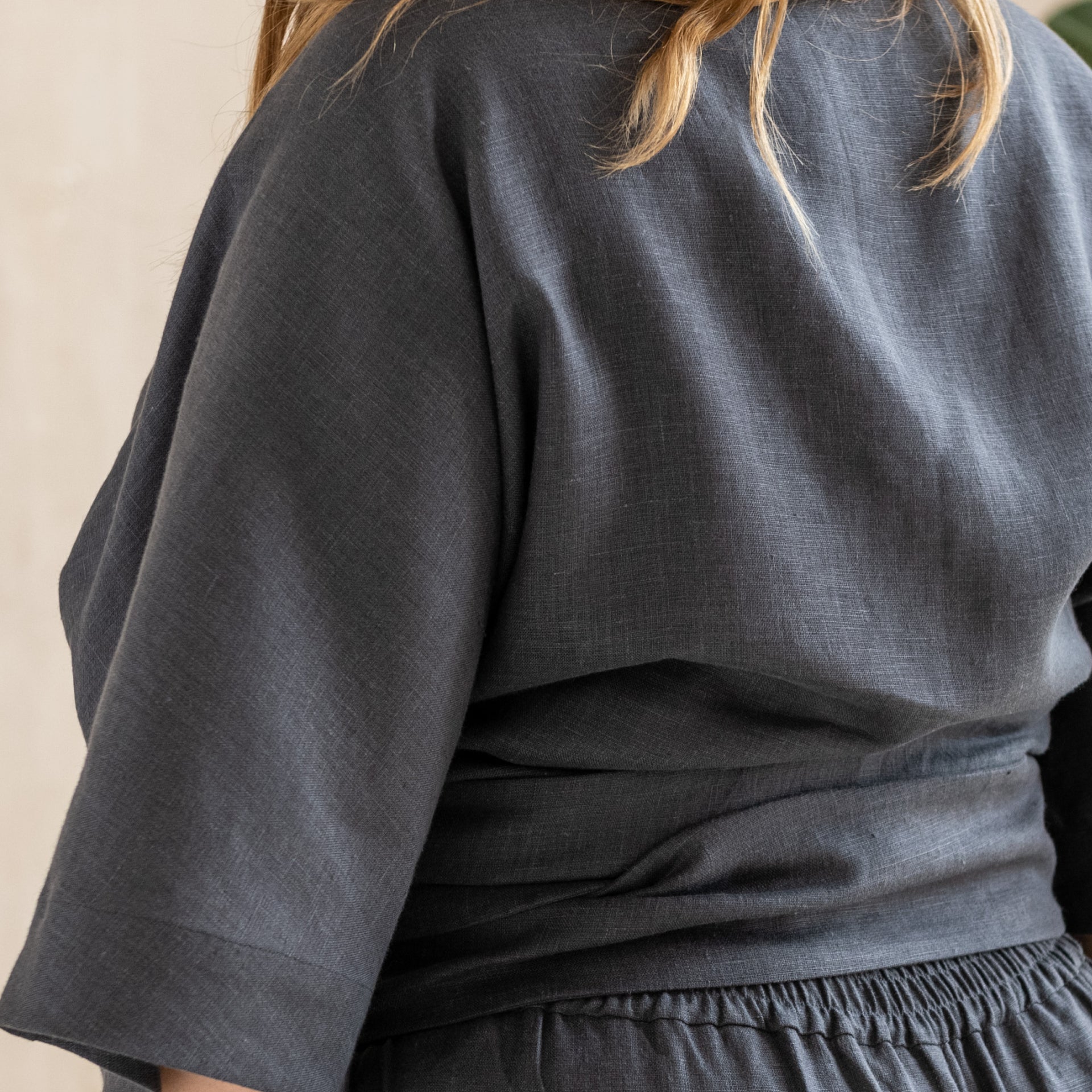 This kimono-inspired stylish set of linen clothing is so comfortable, making it suitable to wear both as home wear and as a night outfit.