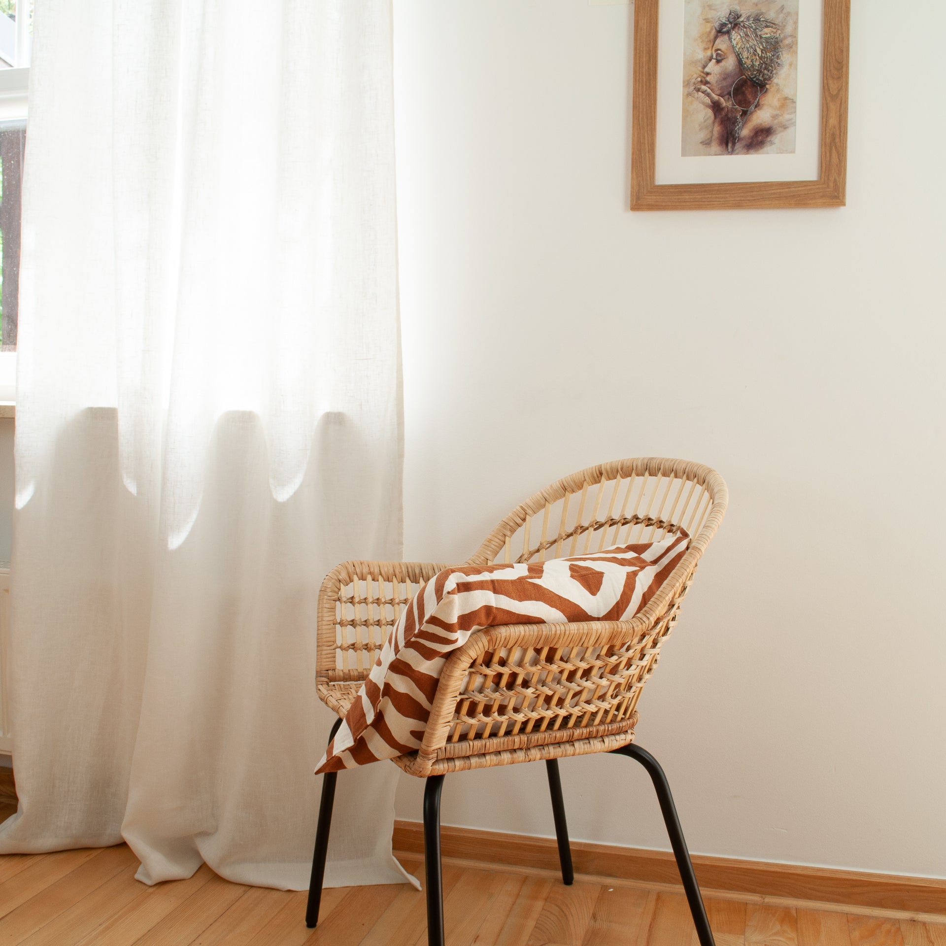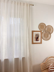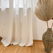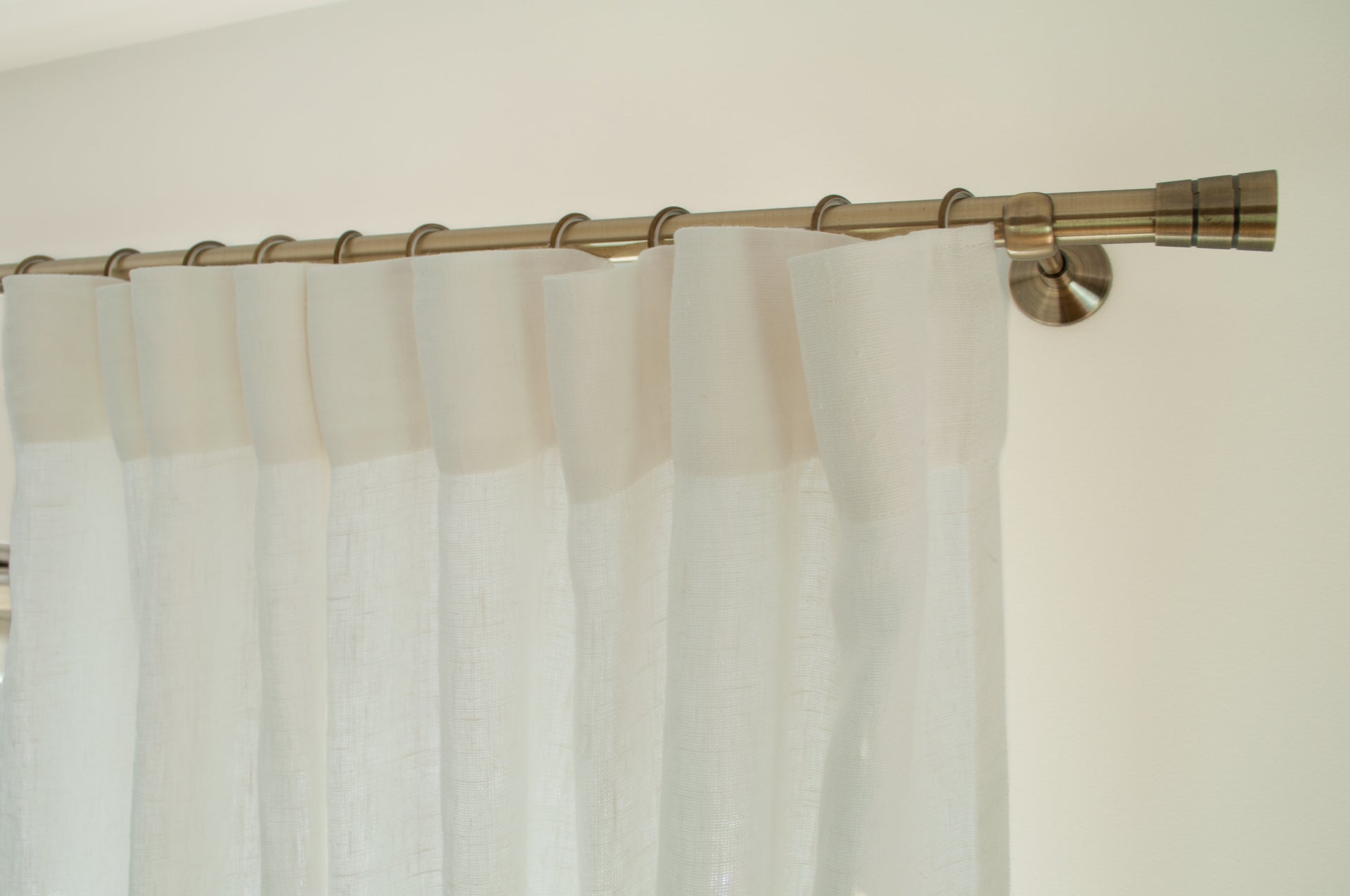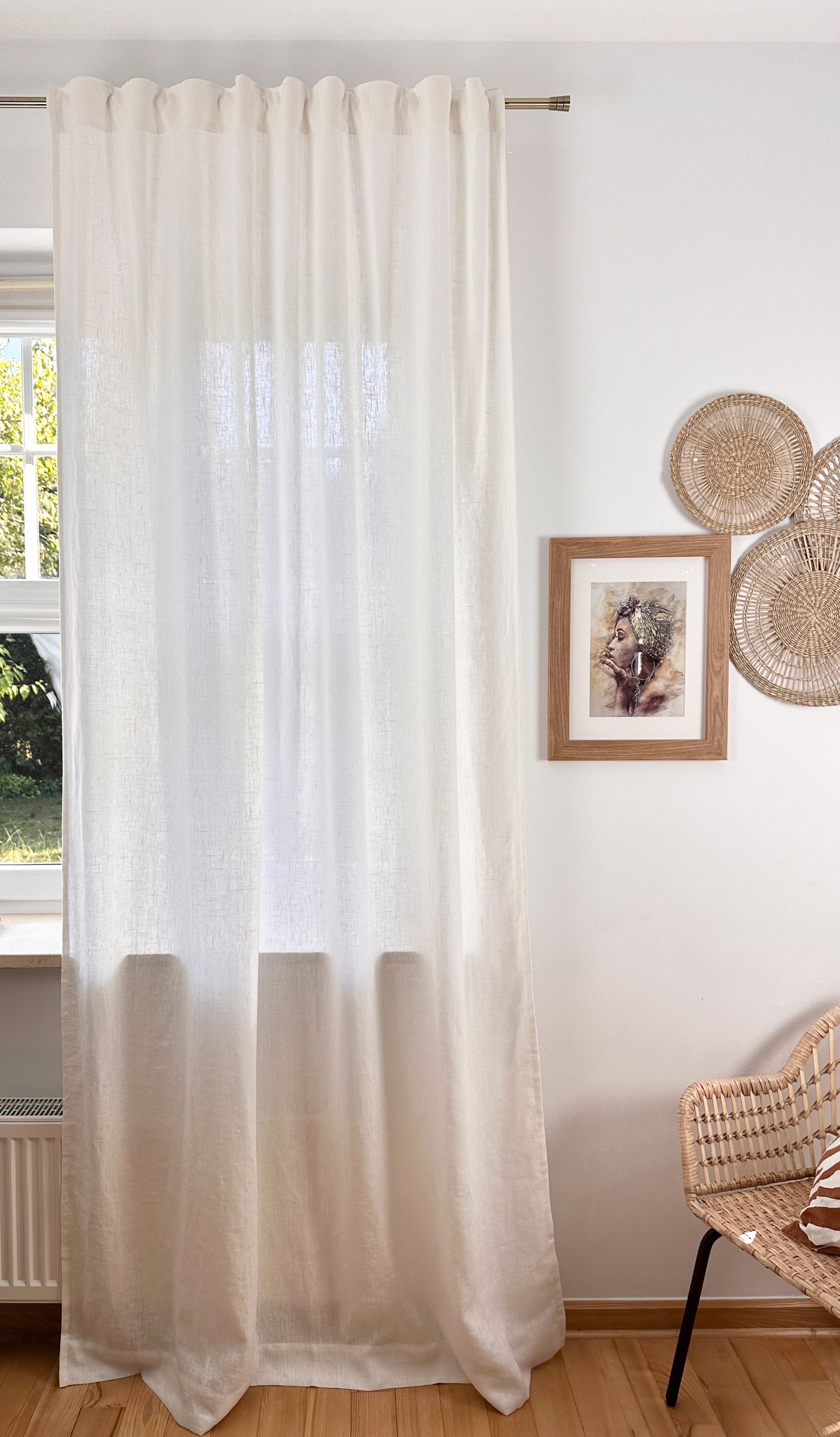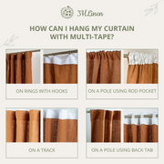 This linen curtain features multiway header for four different hanging options: on a curtain rail with back hidden loops, with curtain hooks and rings, with four-claw curtain hooks or pole pocket.